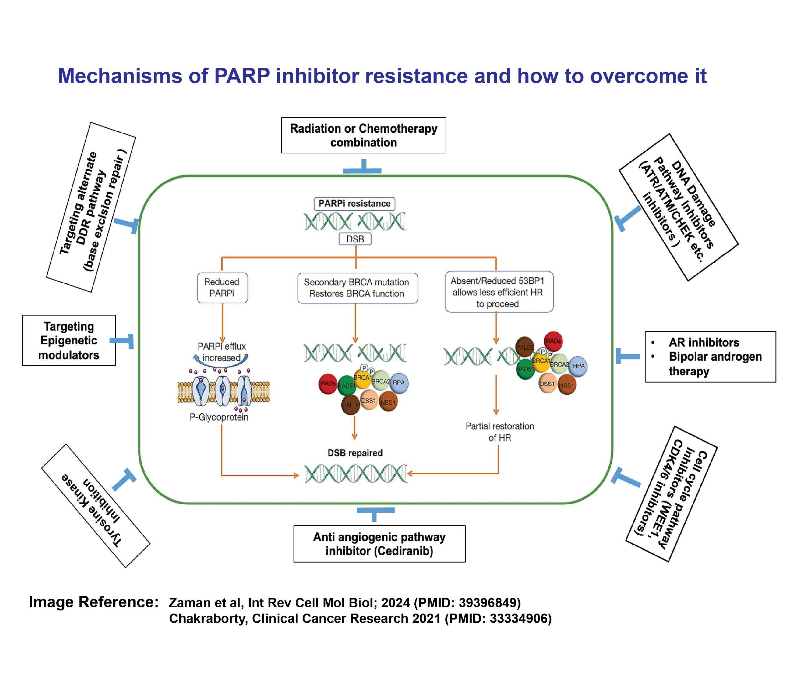 These inhibitors work by trapping PARP, which impairs its activity and increases DNA damage, ultimately leading to cell death through a process known as synthetic lethality.  However, the therapeutic response to these inhibitors lasts only 3 to 4 months, after which the cancer often becomes resistant to PARP inhibitors. Cancer cells can develop resistance through various mechanisms, including secondary reversion mutations in DNA repair pathway genes, enhanced drug efflux, loss of PARP expression, HRR reactivation, replication fork stability, and feedback of the oncogenic signaling pathways. Therefore, overcoming PARP inhibitor resistance is a critical and complex challenge, and there is an urgent need to investigate the molecular mechanisms underlying this resistance in order to develop new therapeutic strategies. Our research aims to address the following questions: 1) Why do some cancers respond better to PARP inhibitors than others? 2) Why do certain patients initially respond to PARP inhibitors but eventually develop resistance? 3) What factors contribute to de novo resistance in some individuals with BRCA2 mutations?