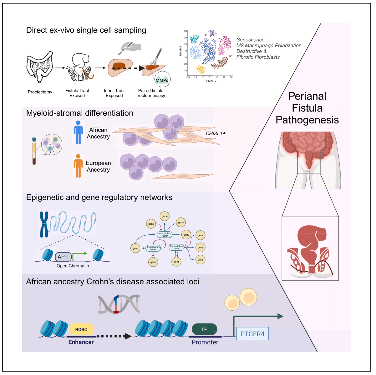 April 2024 – PhD Candidate Rachel Levantovsky has published her work in Med, Multimodal Single Cell Analyses Reveal Mechanisms of Perisnal Fistula in Diverse Crohn’s Disease. Her discovery of unique fistula fibroblasts, distinct monocyte differentiation in individuals of African ancestry, and key transcription factor binding events provides insight into mechanisms that underlie disparities in fistula prevalence.