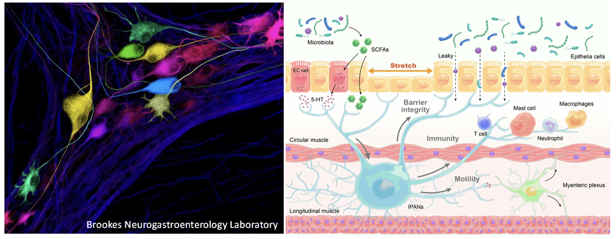 The gut serves as the primary site for digestion, absorption of nutrients, and waste excretion. Additionally, it houses a vast number of microorganisms, collectively known as the gut microbiota, which play a crucial role in influencing communication between the gut and the brain. This communication is essential for both immune regulation and brain health. Therefore, maintaining normal gut function is vital for overall health and well-being. Unlike other abdominal organs, the gastrointestinal (GI) tract possesses its own fully contained nervous system within its walls, known as the enteric nervous system (ENS) or the “second brain” in the gut. The ENS consists of various types of neurons, including sensory, interneurons, motor neurons, and glial cells. Together, these components detect the contents of the gut, regulate secretory function and intestinal movement, maintain immune balance, and preserve the integrity of the intestinal barrier. Although enteric neural circuits represent a significant therapeutic target for various GI disorders, progress in probing and controlling the diverse circuit elements of the ENS has been hindered by technological limitations. We have recently overcome technical obstacles and developed unique resources that allow us to access genetically defined and molecularly distinct neuronal populations in the ENS. By utilizing these innovative neurogenetic approaches, we aim to investigate the specific neuronal populations and neural circuits within the ENS and their impact on GI motility, immunity, and the integrity of the intestinal barrier in both normal and pathological conditions.
