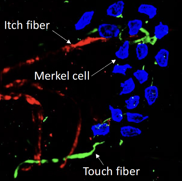 Both spontaneous and mechanical itch responses originate in the skin. Previous research has identified the Merkel cell-slowly adaptive Ab touch fiber complex as a key regulator of mechanical itch in normal conditions. However, in the context of aging or chronic itch associated with dry skin, the loss of Merkel cells removes the inhibition on mechanical itch, leading to the development of alloknesis (mechanical itch sensitization). Our studies have also shown that surviving Merkel cells in mice, following experimental dry skin treatment, can establish a functional connection with MrgprA3-expressing itch fibers and promote spontaneous itch. Notably, the mechanosensitive Piezo2 channels expressed by Merkel cells are essential for inhibiting mechanical itch and promoting spontaneous itch through the activation of slowly adaptive Ab fibers and C-pruriceptors, respectively. These findings have significantly contributed to our understanding of how Piezo2 channels and Merkel cells influence itch signaling in the skin. However, the mechanisms by which Merkel cells respond to tissue injury, skin inflammation, and aging, as well as the impact of these changes in Merkel cell biology on their interaction with touch and itch fibers in the skin, remain incompletely understood. Furthermore, we will investigate whether Merkel cells play a role in the development of skin inflammation, in addition to their involvement in itch signaling.