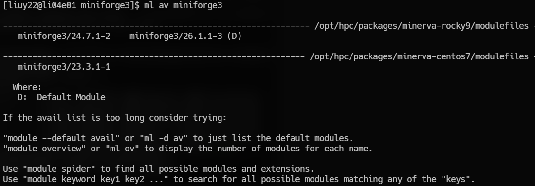 The conda package and environment manager is included in all versions of miniforge3. Many versions of miniforge3 are available to use on Minerva. To see a list of installed versions of miniforge3 on the cluster, use Lmod’s spider command: